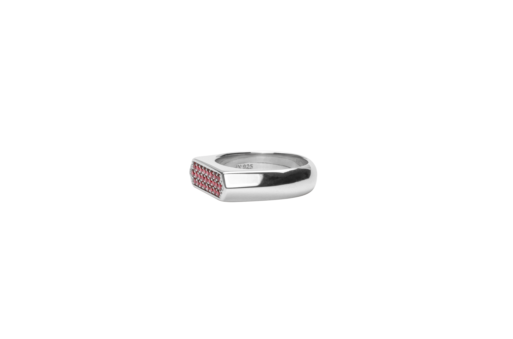 Sharp lines, expressive and eye-catching, with red stones.• This style is made from 100% recycled 925 sterling silver.  • The top-plate of the ring measures 5 x 17 mm.• All our jewellery is stamped with 925 IX on the inside, which is our professional hallmark registered with the Danish Assay Office.