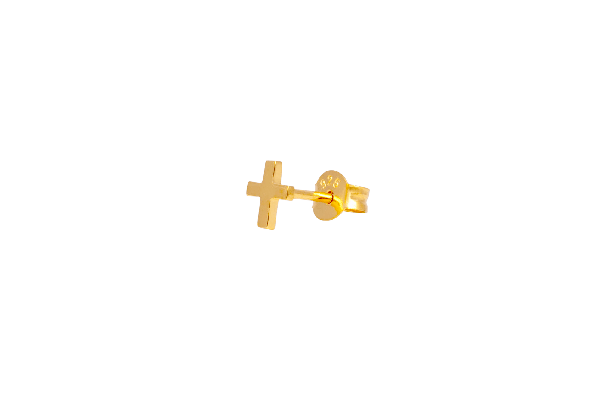 The cross earstud. This earring is perfect for everyday use and special occasions. • This style is made from recycled 22 karat gold plated 925 sterling silver.