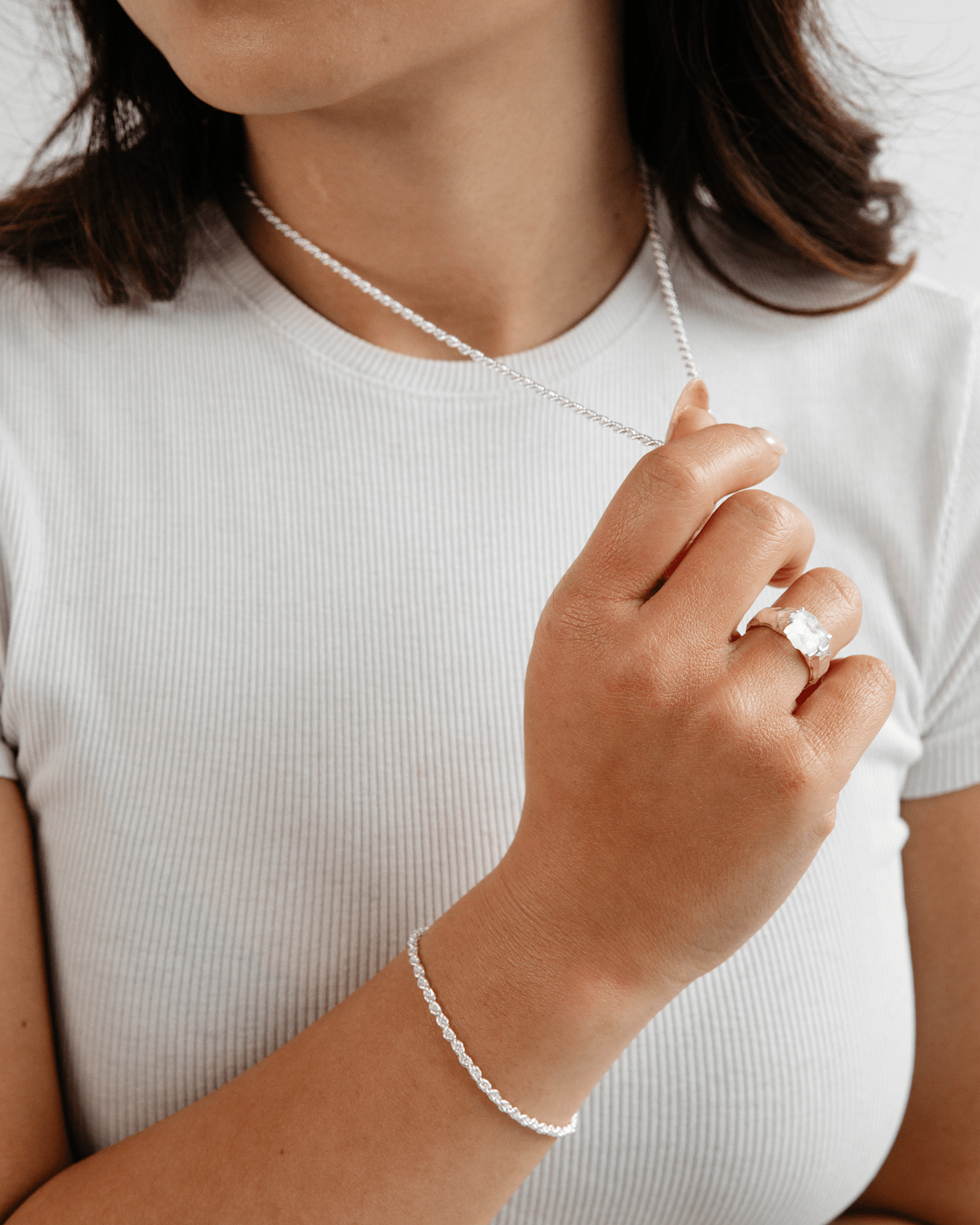 Jewellery set consisting of IX Sam Chain Silver and IX Sam Bracelet Silver. When purchasing the set, you save 20% on the necklace and bracelet. Small: 17 cm bracelet and 45 cm necklace. Medium: 19 cm bracelet and 50 necklace. Large: 21 cm bracelet and 55 cm necklace