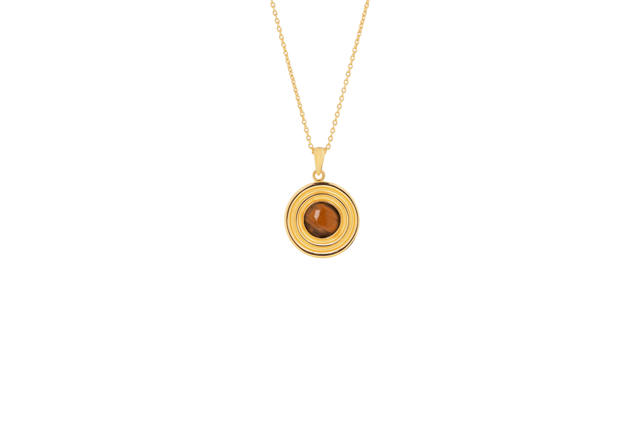 Unique pendant shaped as an amulet with a natural tiger eye stone. • The pendant measures 18 mm in diameter.
