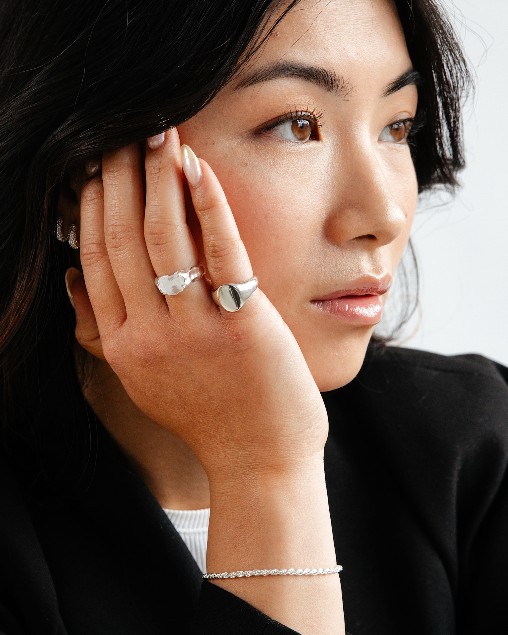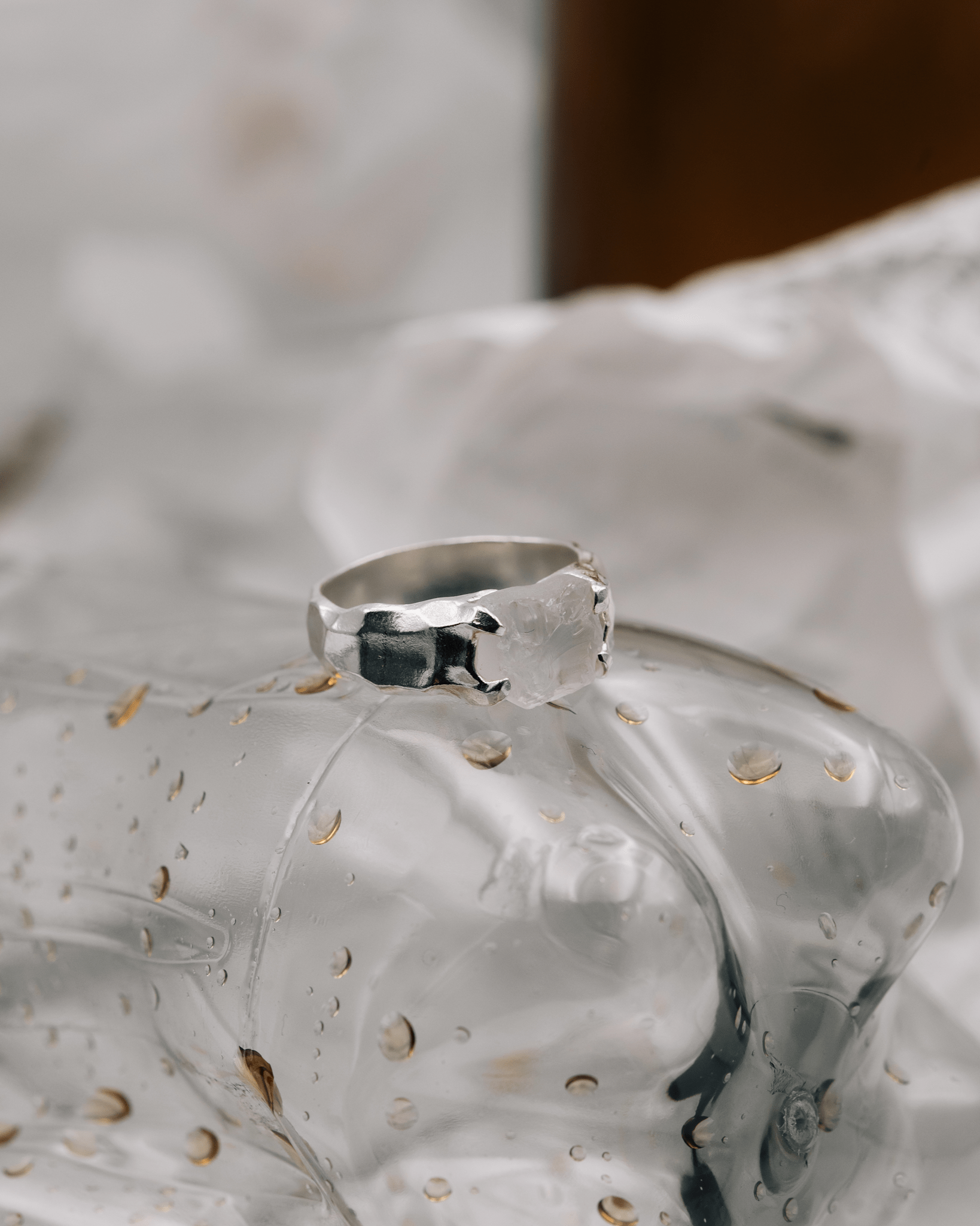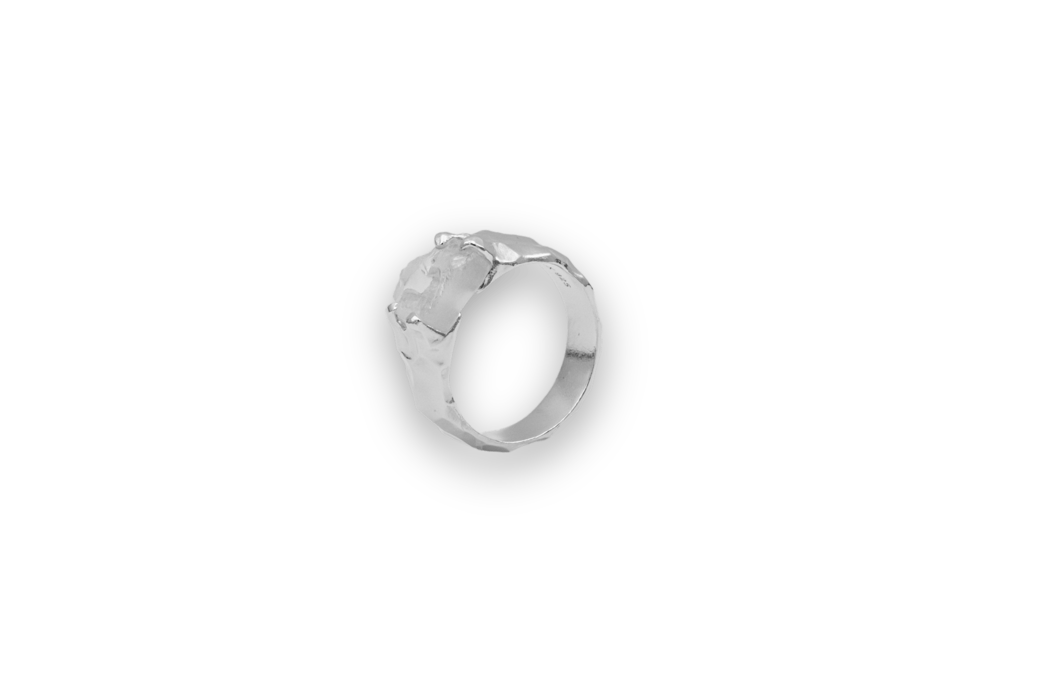 The Avy Ring is a unique statement ring featuring a nature-inspired surface and a stunning mountain crystal. As the smaller version of the Lolo Ring, the Avy Ring boasts an edgy look that adds raw elegance to your outfit. Bring a touch of nature's beauty to your jewelry collection with the Avy Ring.