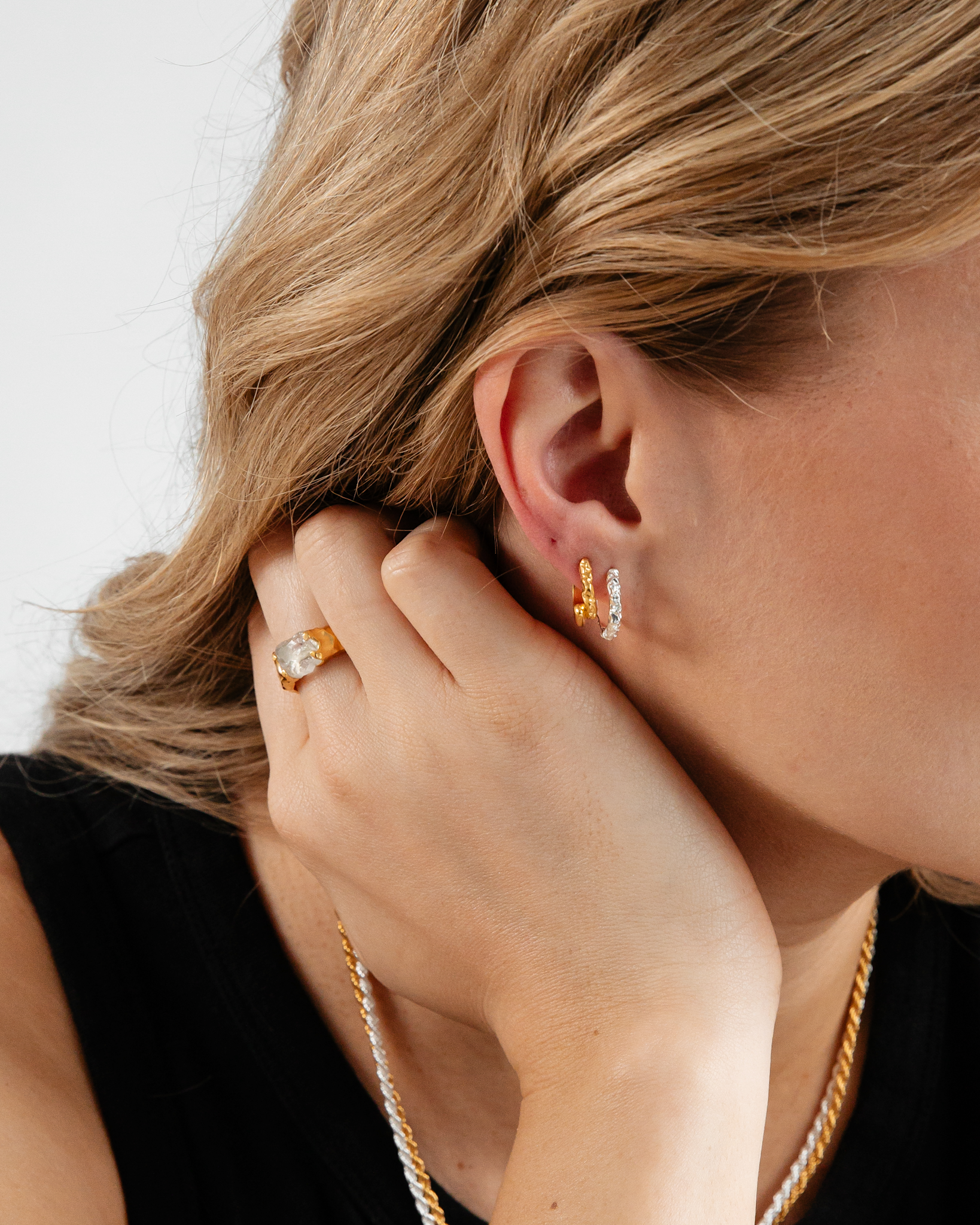 These hoop earrings are inspired by elements of nature – mountains, rocks, and the textures of sand. Their unique design captures the raw beauty of nature, adding an organic touch to your jewellery collection.