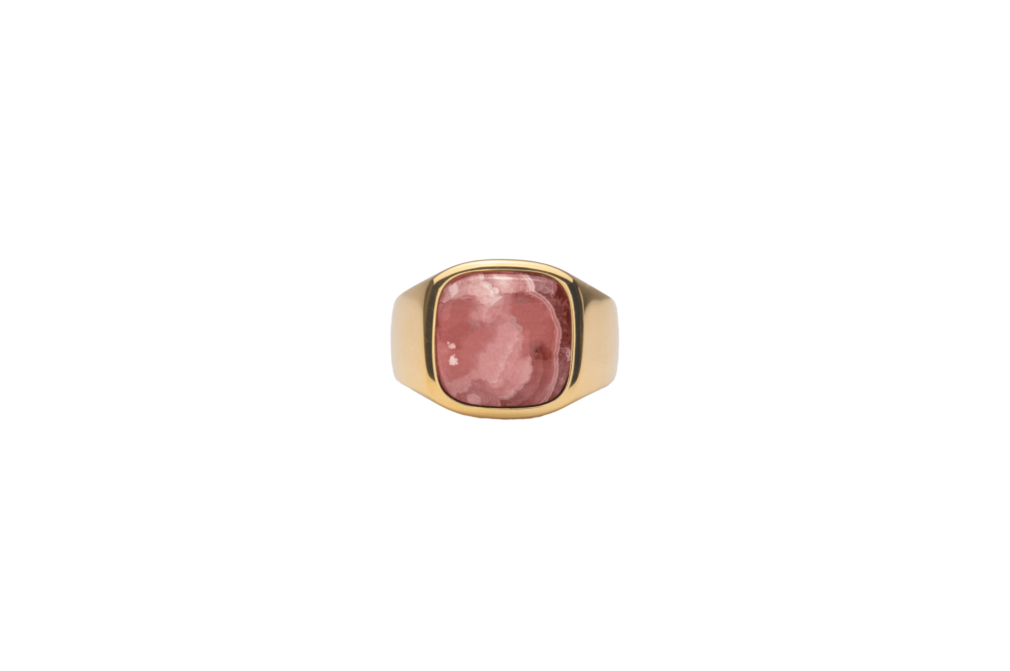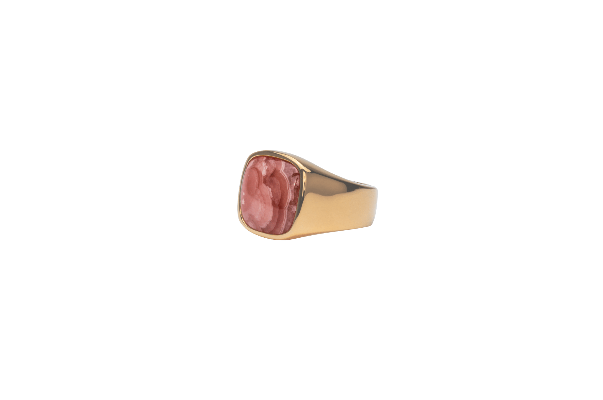 Unisex signet ring with soft edges and a Rhodocrosite stone.• The style's top plate measures 14 x 14 mm.• This style is made from 100% recycled 22 karat gold-plated 925 sterling silver. • All our jewellery is stamped with 925 IX inside, which is our own hallmark registered with the Danish Assay Office.• Rhodocrosite is known for its energies and magical qualities. The person who carries this ring will feel relaxed, patient and be in total self-control.