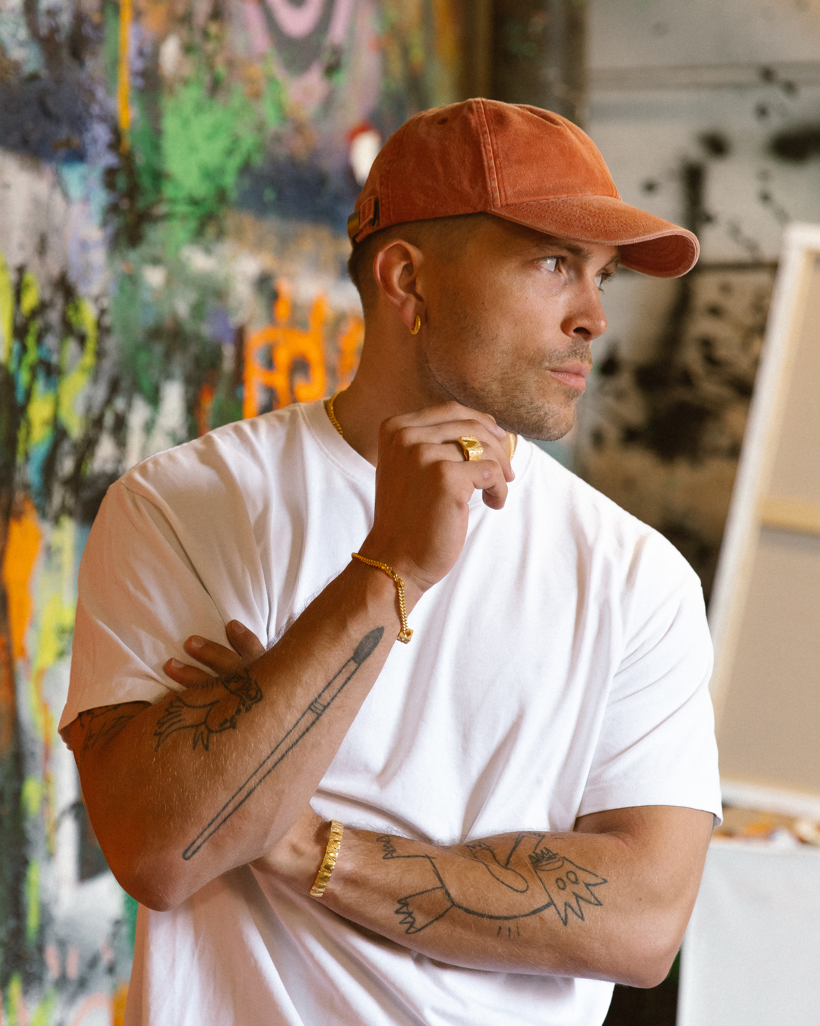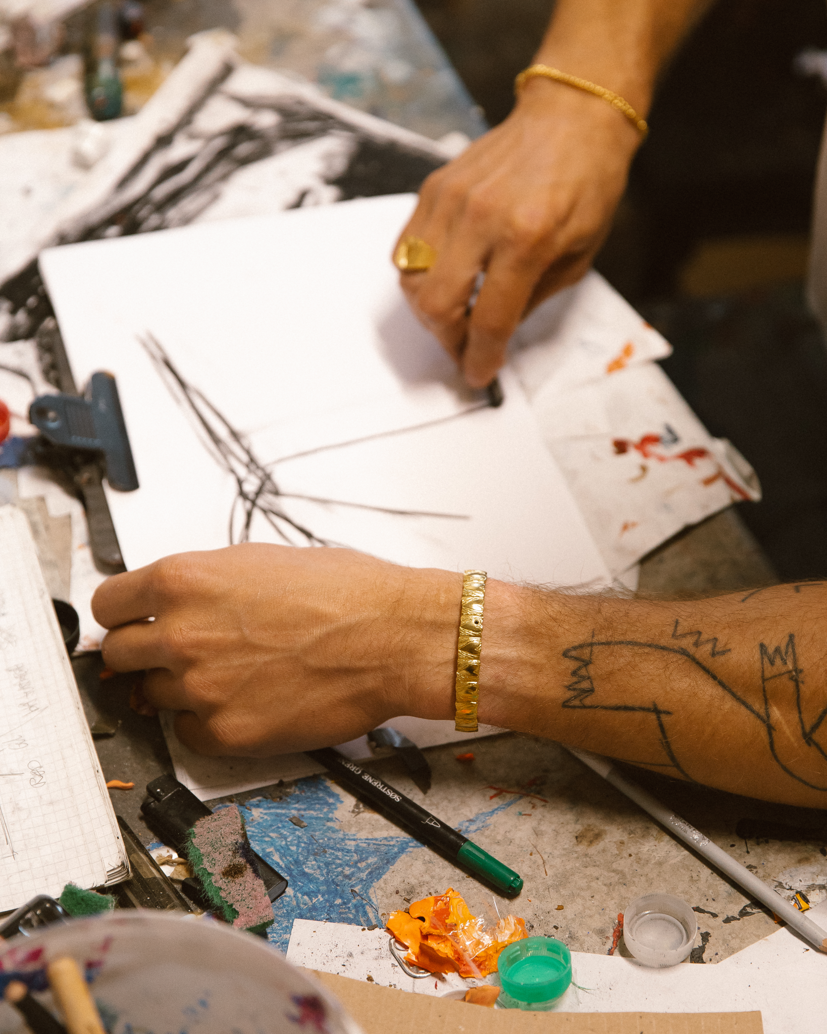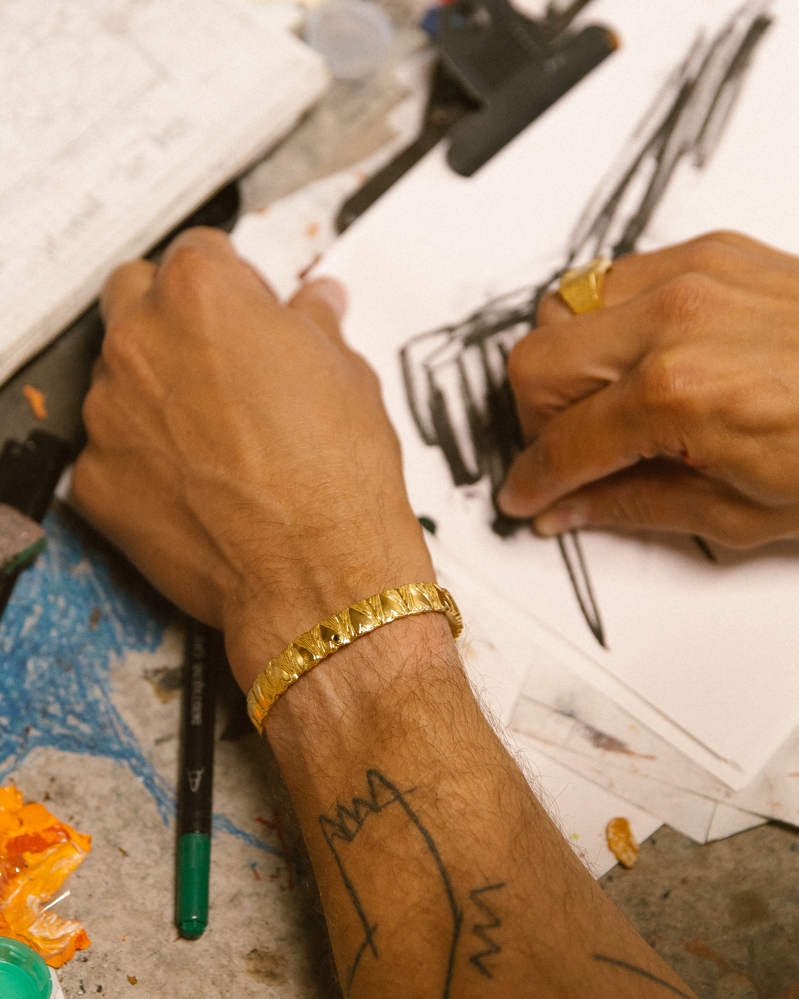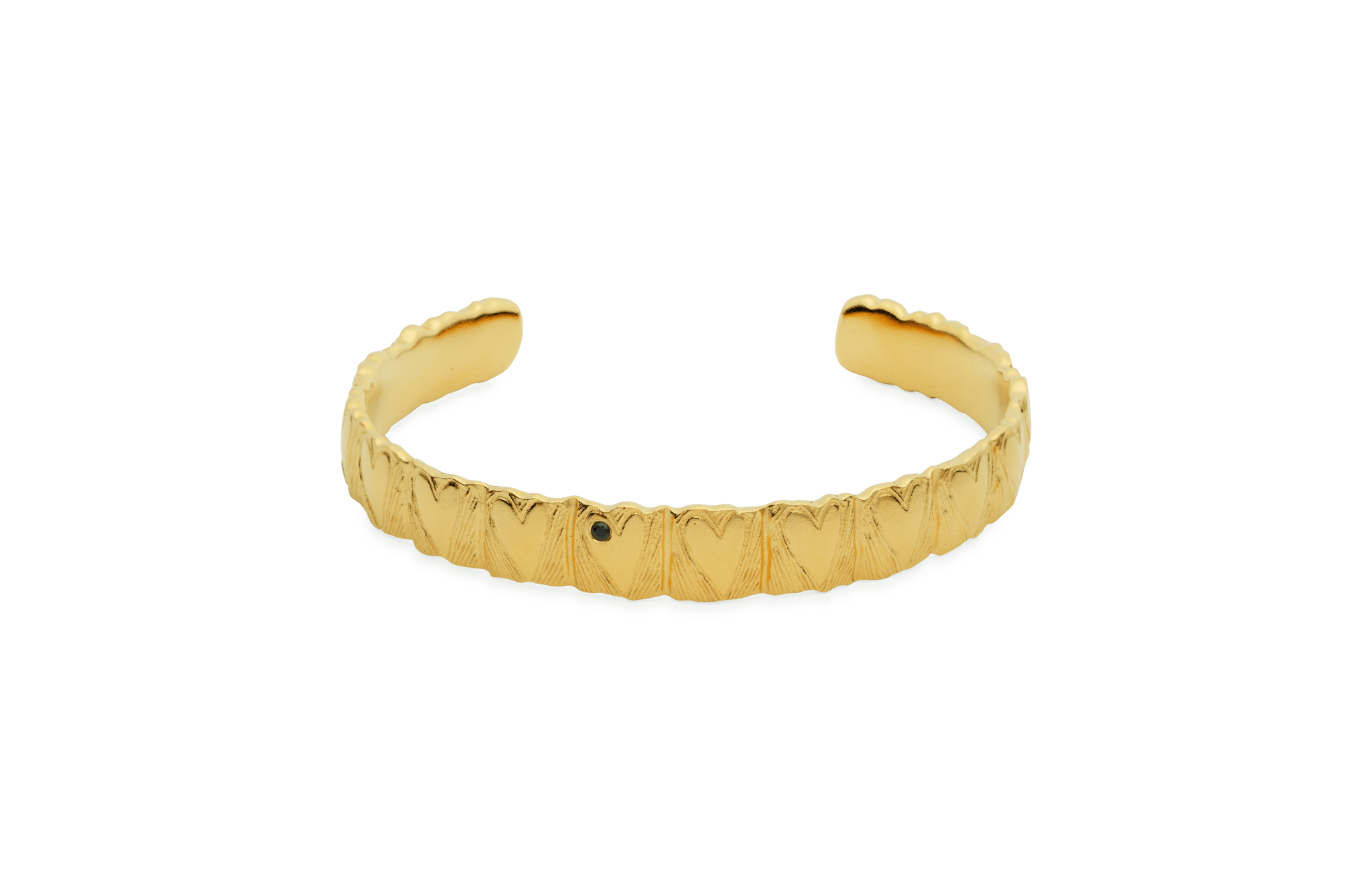 This Cuff bracelet is decorated with artist Martin Brachér's signature hearts, one of which bears a black glittering stone. The bracelet reminds you to appreciate life's little moments and your connection to something bigger.Limited Edition jewellery by artist Martin Brachér.The bracelet is made from 100% recycled 22 Karat gold-plated 925 sterling silver.The bracelet measures 8 mm in height.All our jewellery is stamped with 925 IX on the inside, which is our professional name stamp, registered by Danish Precious Metals Control.