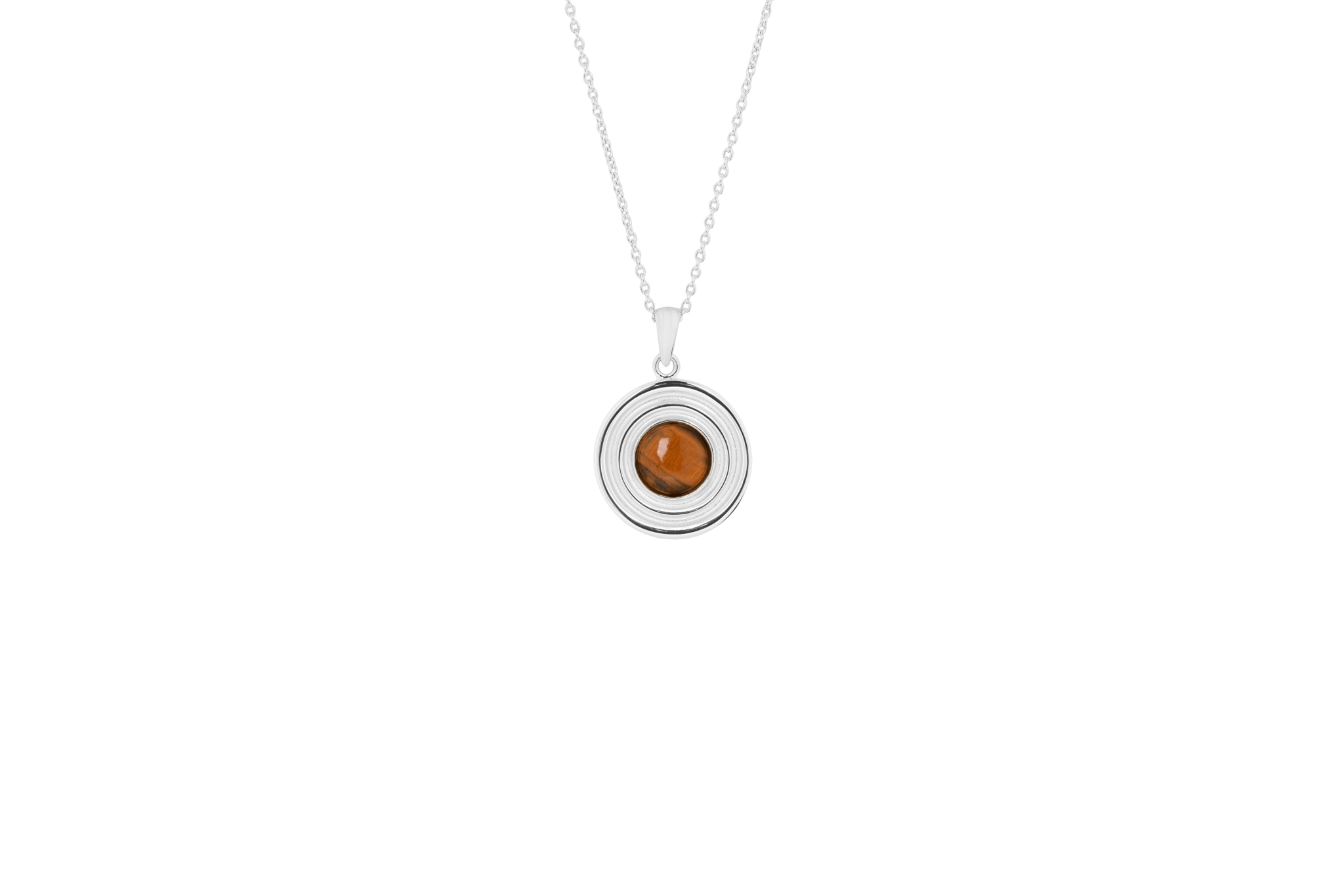 Unique pendant shaped as an amulet with a natural tiger eye stone. • The pendant measures 18 mm in diameter.